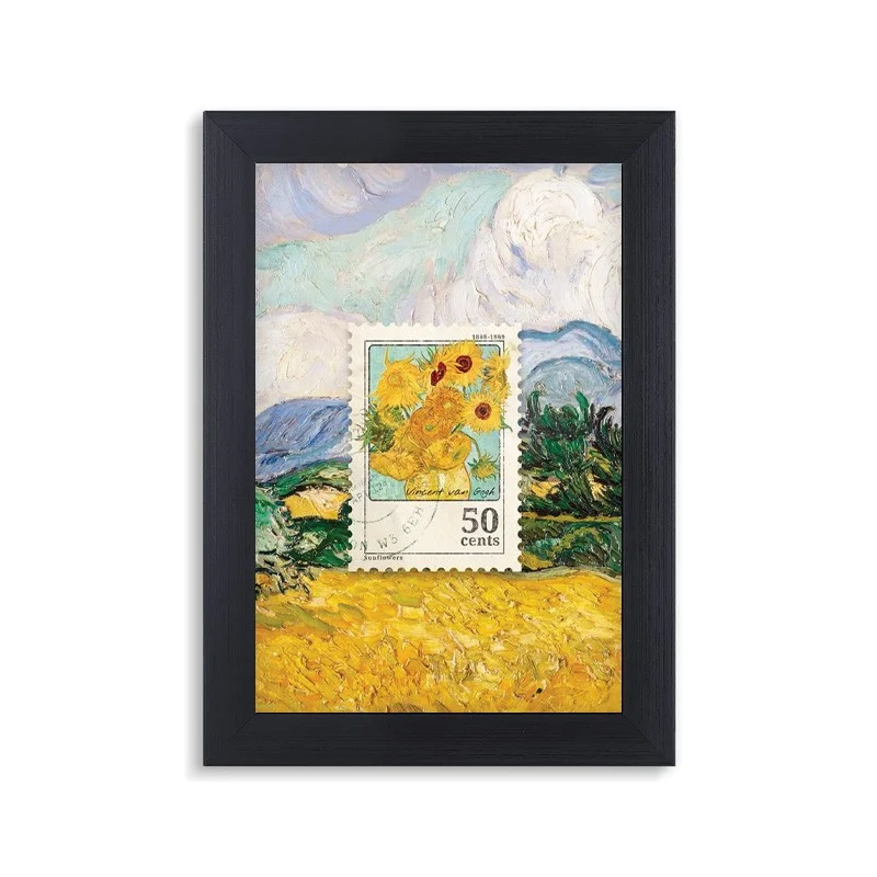 قاب و تابلو تمبر آفتابگردان با فریم مشکی PVC تولید و عرضه شده، سایز پوستر داخل این قاب عکس 10 در 15 سانتی‌متر است.