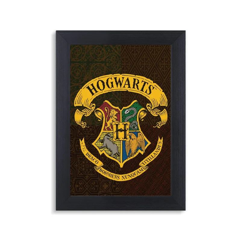 قاب و تابلو لوگو هاگوارتز با فریم مشکی PVC تولید و عرضه شده، سایز پوستر داخل این قاب عکس 10 در 15 سانتی‌متر است.