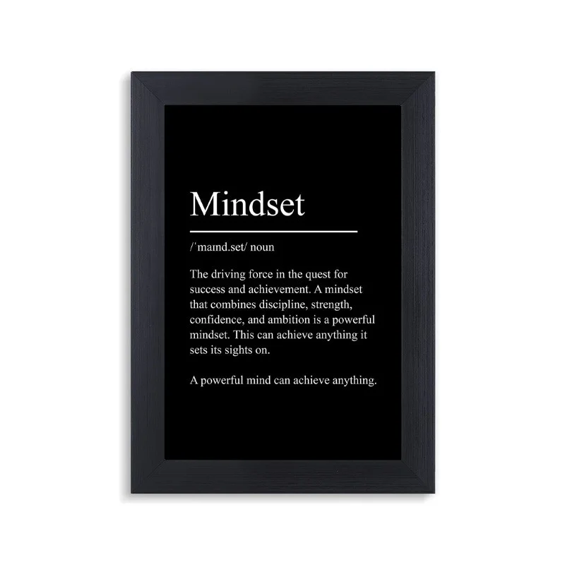 قاب و تابلو mindset نوشته با فریم مشکی PVC تولید و عرضه شده، سایز پوستر داخل این قاب عکس 10 در 15 سانتی‌متر است.
