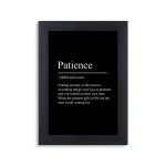 قاب و تابلو Patience نوشته با فریم مشکی PVC تولید و عرضه شده، سایز پوستر داخل این قاب عکس 10 در 15 سانتی‌متر است.