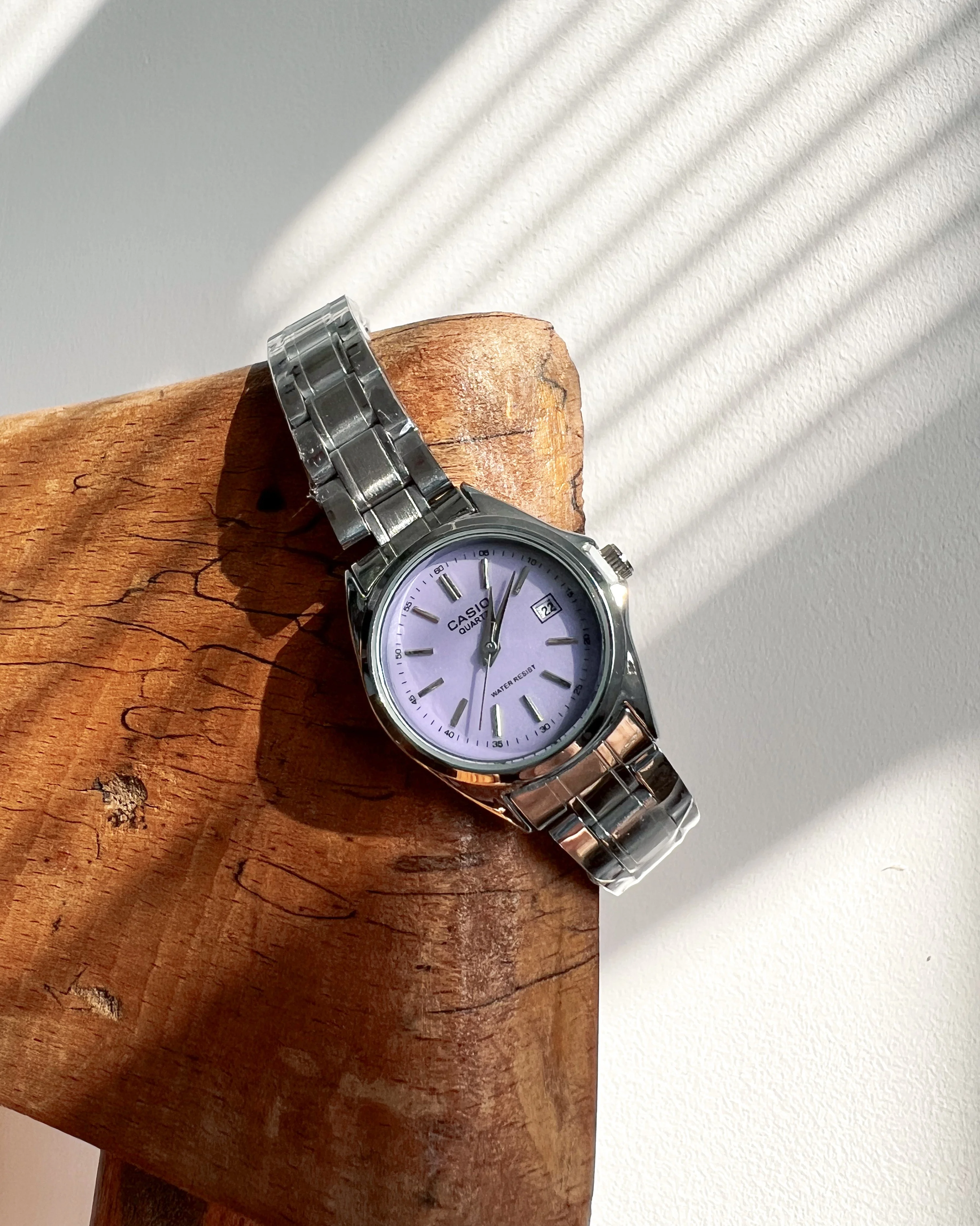 این ساعت کاسیو طراحی کلاسیک و شیکی دارد که با صفحه بنفش و بند استیل، ظاهر خاصی به آن بخشیده است.