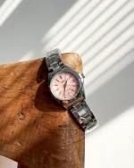 این ساعت کاسیو طراحی کلاسیک و شیکی دارد که با صفحه صورتی و بند استیل، ظاهر خاصی به آن بخشیده است.