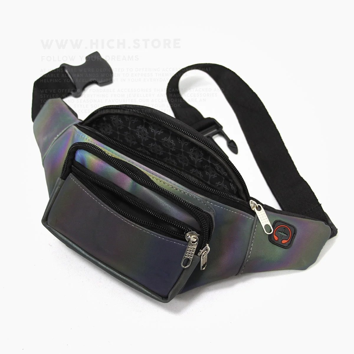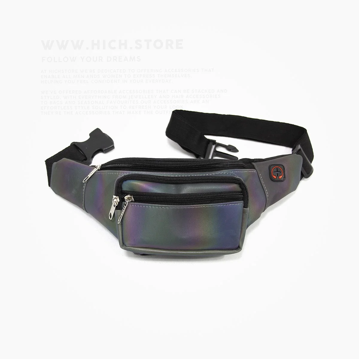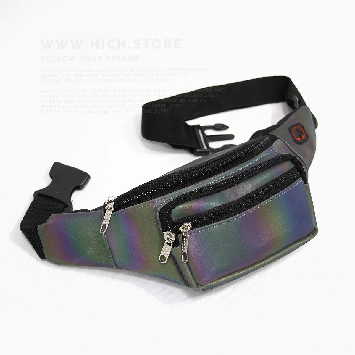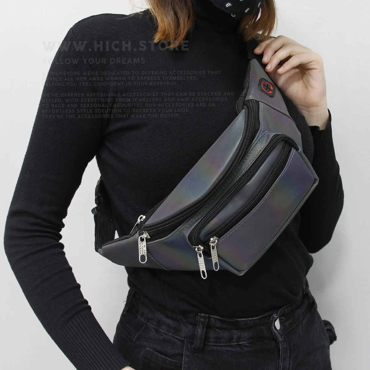 کیف کمری هولوگرامی مشکی (Holographic) هیچ استور بسیار سبک بوده و دارای دوختی فوق العاده با کیفیت هستند. ویژگی برجستهی کیف های هولوگرامی، تلفیق جالب بازتاب فلزی و رنگینکمانی است. انعکاس نوری و رنگی کیف های هولوگرام با هر رنگی در استایل شما هماهنگ میشود و هارمونی زیبایی از رنگها و درخشندگی را برای تیپ شما به ارمغان میآورد.
